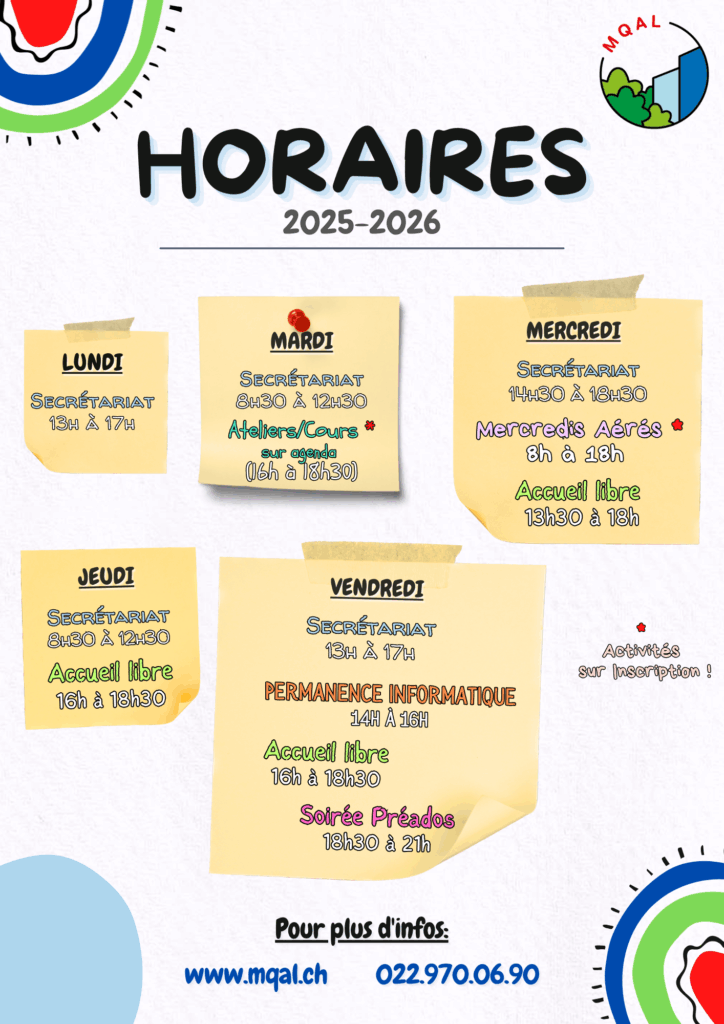 L’association dispose de deux lieux d’animation qui proposent deux programmes d’activités distincts. Les secteurs enfants, préados et tout public se situent à La Maison de Quartier d’Aïre, tandis que les secteurs adolescents et jeunes adultes se trouvent à la Carambole
