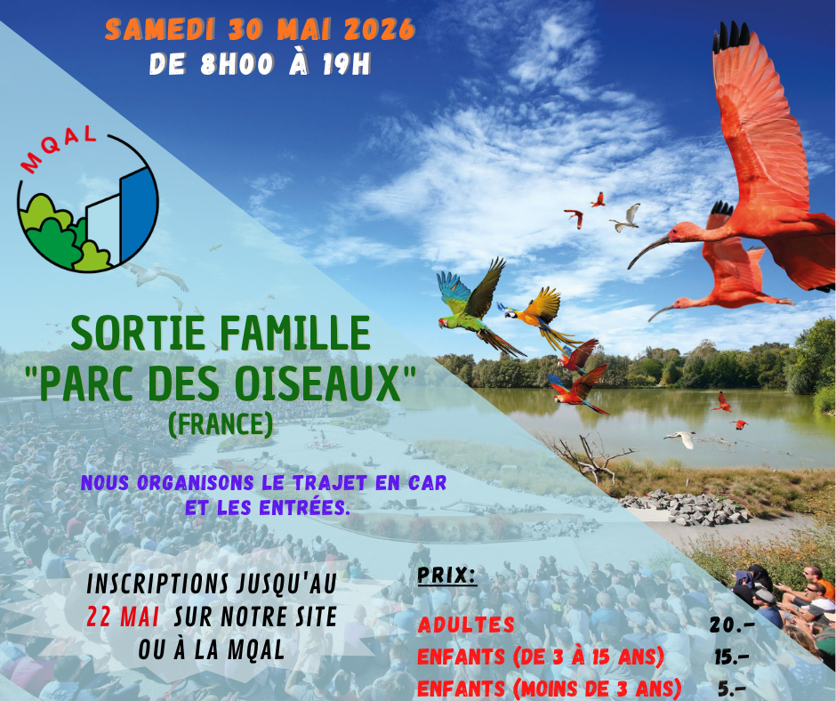 Sortie famille la prochaine sortie Famille aura lieu le samedi 30 mai 2026. Inscrivez-vous à l’aide du formulaire ci dessous Je suis: Je veux m'inscrire à La prochaine sortie culturelle ... Parc aux oiseaux du 30 Mai 2026 L'inscription est pour ... —Veuillez choisir une option—Une famille Veuillez choisir le nombre de participants par catégorie. Nombre d'adultes (16 ans et plus) Nombre d'enfants (3 à 15 ans) Nombre d'enfants (0 ans à 2 ans) Participants adultes: Participants Enfant de 3 à 15 ans: Participants enfants (0 à 2 ans) Date de naissance Données enfant 2 Date de naissance Données enfant 3 Date de naissance Données enfant 4 Date de naissance Êtes-vous le représentant légal ? OuiNon Seul les représentants légaux ont le droit d'inscrire un mineur à nos activités. Nombre d'enfants L'un de vos enfants a-t-il des allergies ou des besoins particuliers ? OuiNon Données enfant 1 Date de naissance Ecole fréquentée --Ecole d'AïreEcole du LignonAutre établissement scolaire Données enfant 2 Date de naissance Ecole fréquentée --Ecole d'AïreEcole du LignonAutre établissement scolaire Données enfant 3 Date de naissance Ecole fréquentée --Ecole d'AïreEcole du LignonAutre établissement scolaire Données enfant 4 Date de naissance Ecole fréquentée --Ecole d'AïreEcole du LignonAutre établissement scolaire > Message J'accepte les Conditions de participation MQAL Montant à Payer (en CHF)